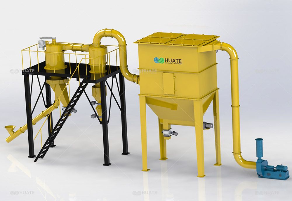 整套分级装置由气流分级机、旋风收集器、脉冲除尘器、高压引风...